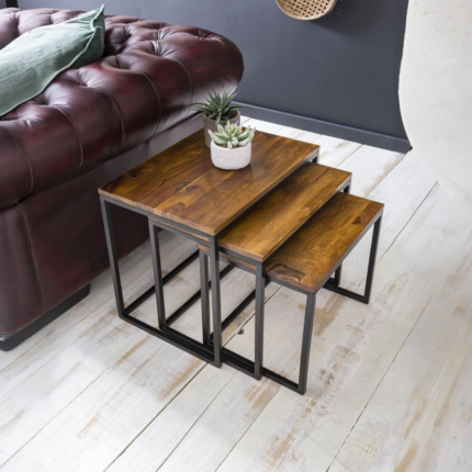 Stylish set of 3 industrial nesting tables with rustic wooden top and strong black metal frame. Space-saving, durable, and perfect for modern Indian homes.