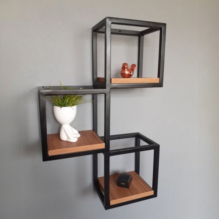 Modern geometric cube wall shelves with wooden base and black metal frame. Perfect for stylish wall décor and compact storage.
